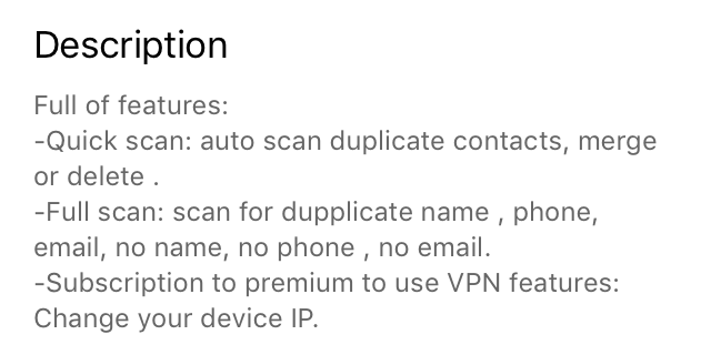 According to this, “Mobile protection :Clean & Security VPN” is “Full of features” — well, it’s certainly full of something. Apparently, “Mobile protection” includes protecting you from “dupplicate” contacts. And these “scans” are what the screenshots claim as “Quick & Full Scan Internet Security”. Five internets to anyone who can figure out the relationship between Internet Security and duplicate contacts.